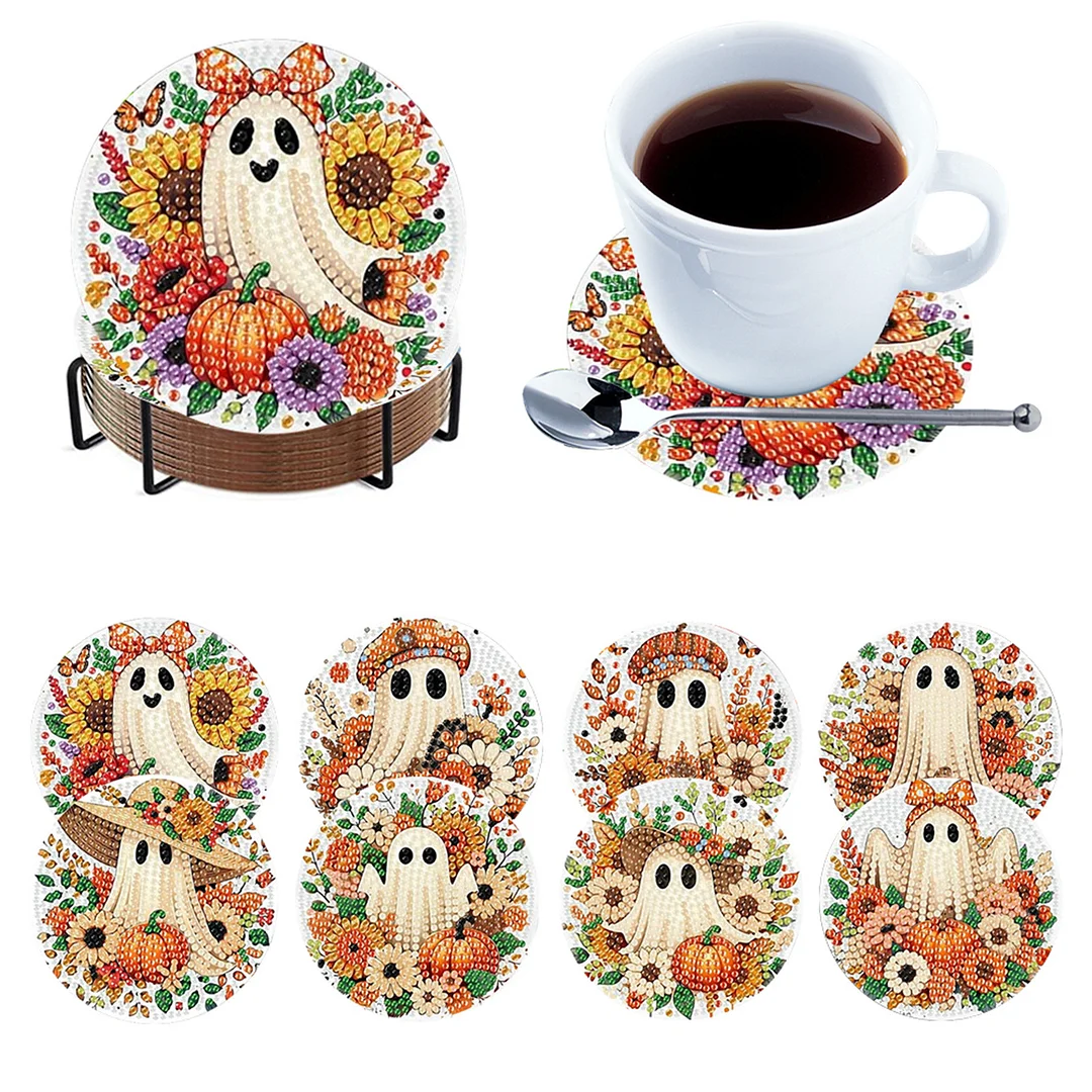 8pcs Cartoon DIY Diamond Painting Holz Untersetzer Kits mit Halter (Kürbis)