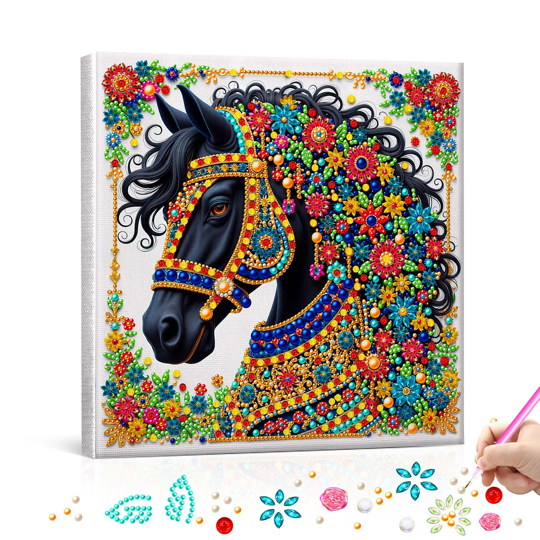 Schwarz-Gold-strukturiertes Mandala-Pferd speziell geformte 5D-DIY-Teilbohrer-Diamanten-Punkte, Edelstein-Kunst-Kits mit Rahmen, Diamanten-Gemälde, Ed