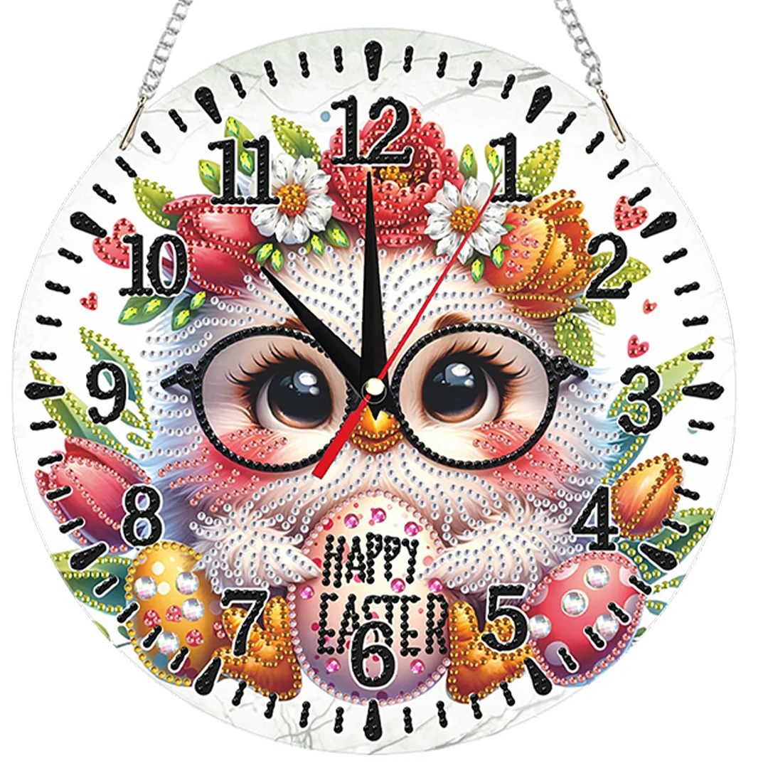 White Chick 2D flache DIY-Acryl-Diamantmaler-Uhrenanhänger mit Uhrenfunktion 9,65x9,65 Zoll für Hauswand- oder Fensterdekoration